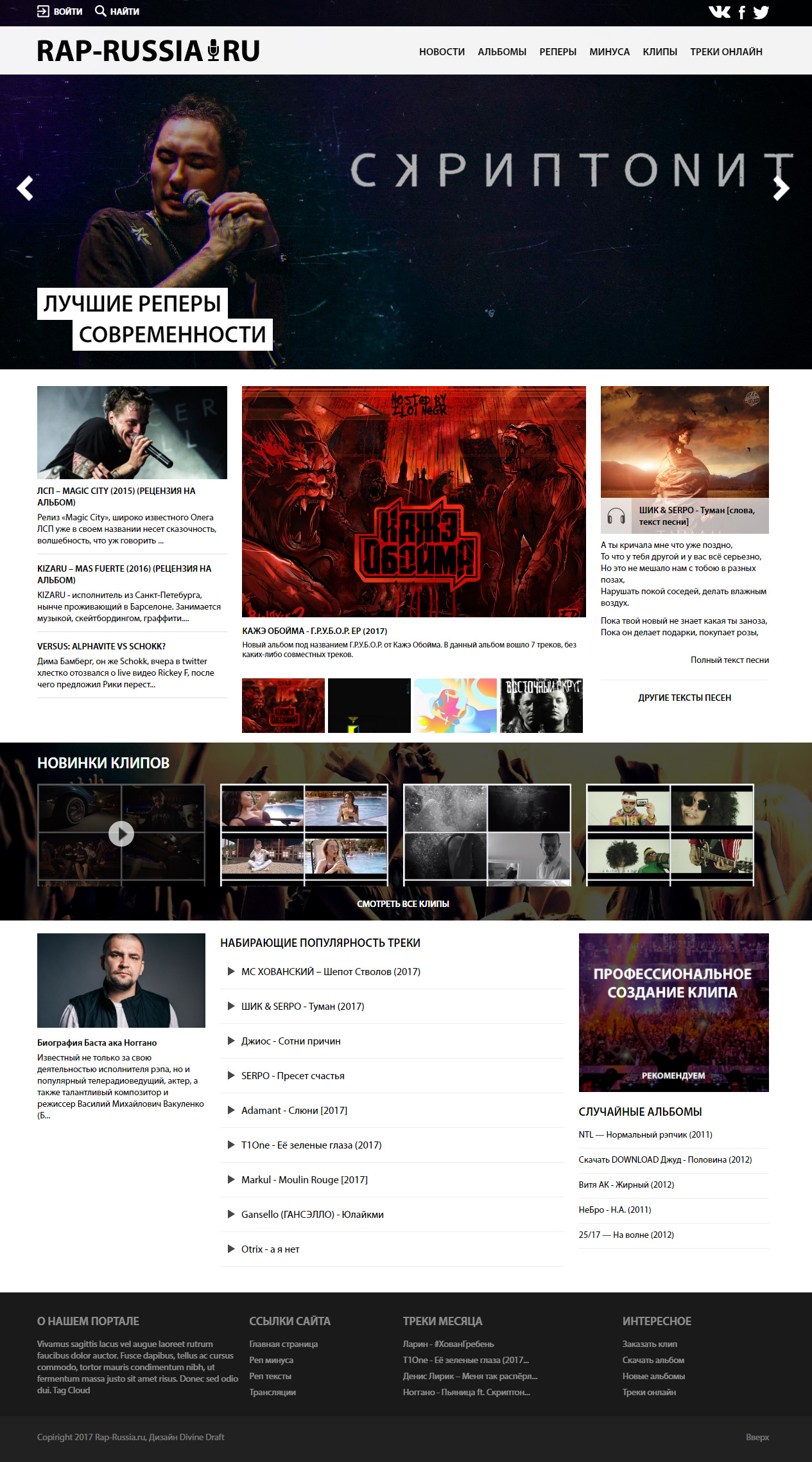 Полная разработка, российского реп портала. Основные возможности: предварительное прослушивание музыки, логично сформированный плейлист, простота в использовании. Главное, чем мы руководствовались при его создании - сделать комфортное время провождение на сайте, чтобы на него возвращались вновь и вновь.