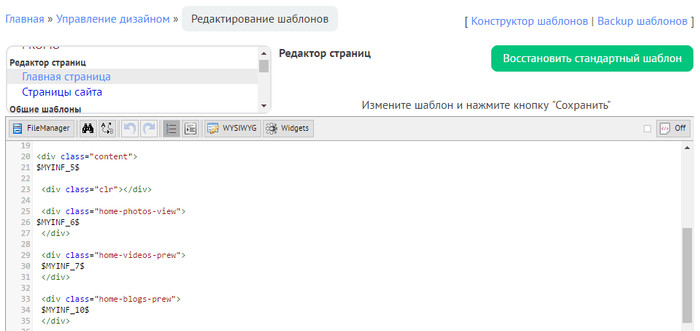 Заходим на нее. Открываем нашу папку с шаблоном » Стилизация модулей » Редактор страниц » файл Главная страница.txt, копируем весь код и вставляем на уже на ваш сайт, сохраняем.